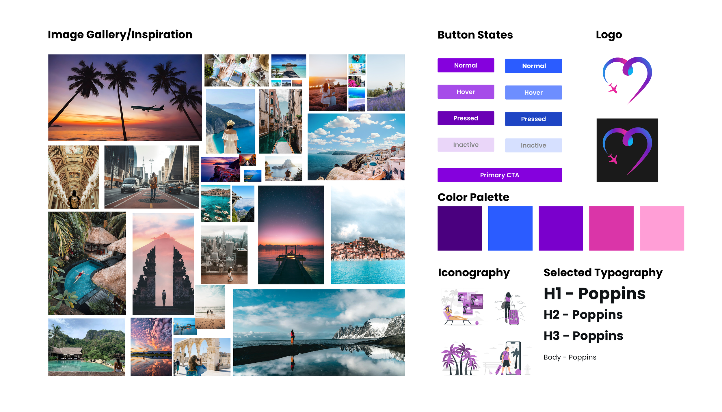 A bold blue and purple gradient evoked trust and exploration, while the heart-shaped logo reflected a passion for travel. Poppins and Playfair Display fonts provided a balanced combination of modern readability and elegance.