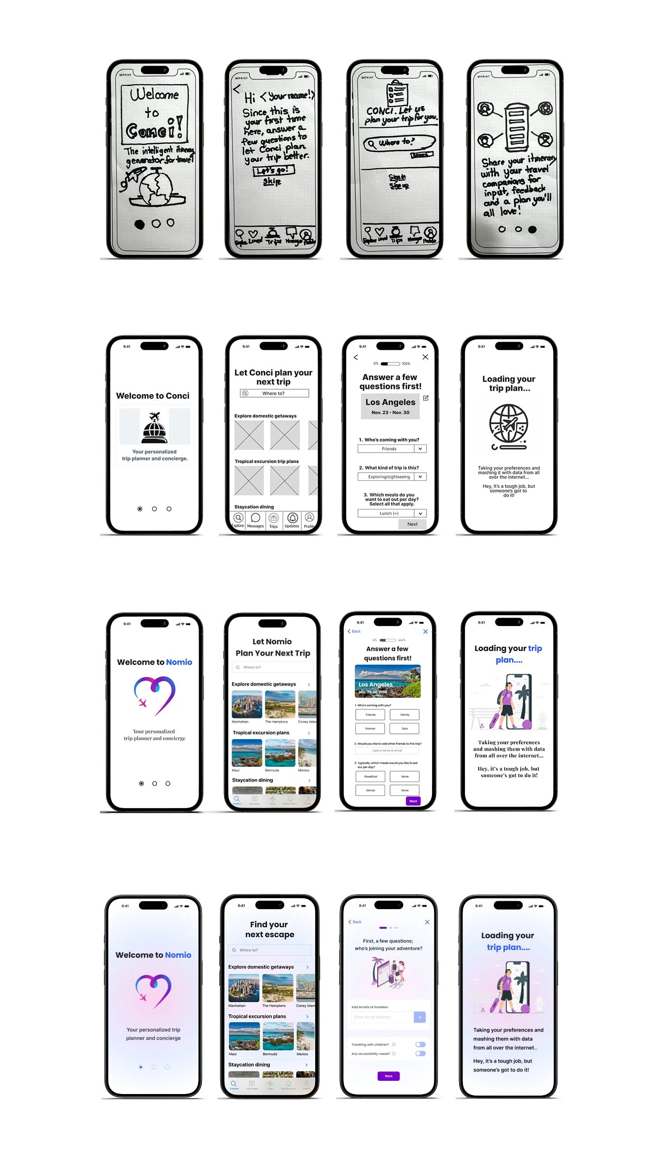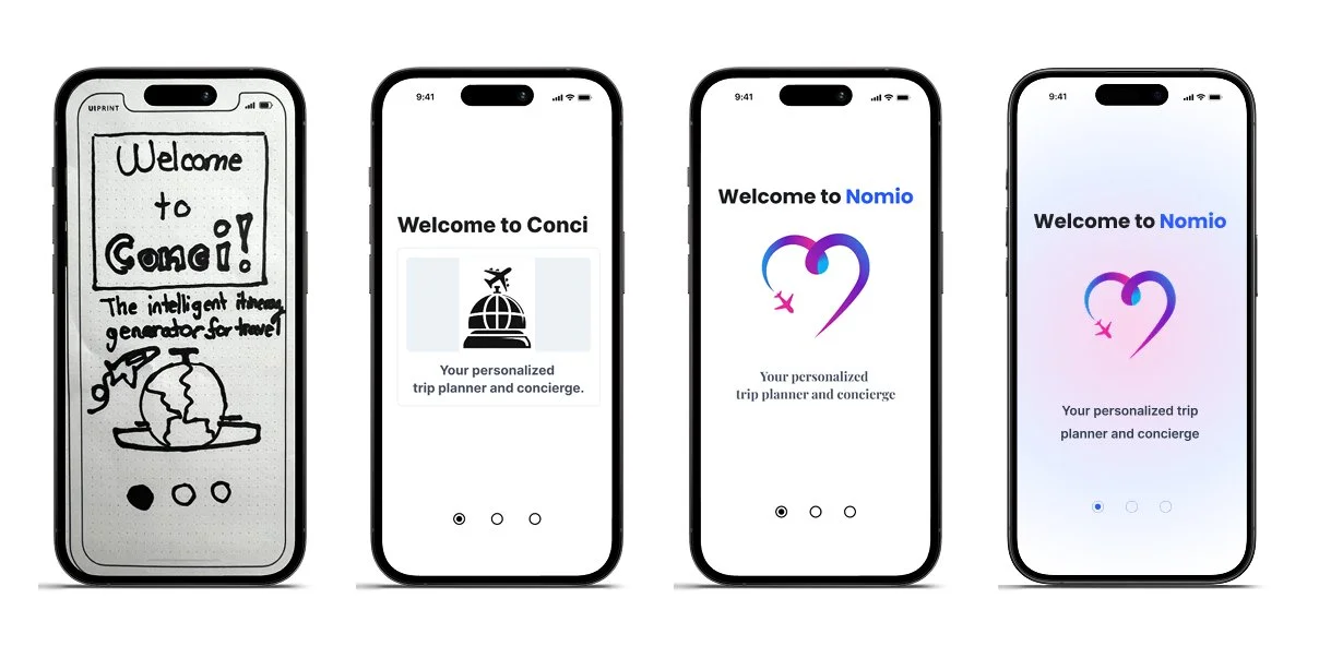 Negative feedback on the app's original names, Conci (in low-fi) and Wanderwise (in mid-fi). However, the final name, Nomio, received a positive response.